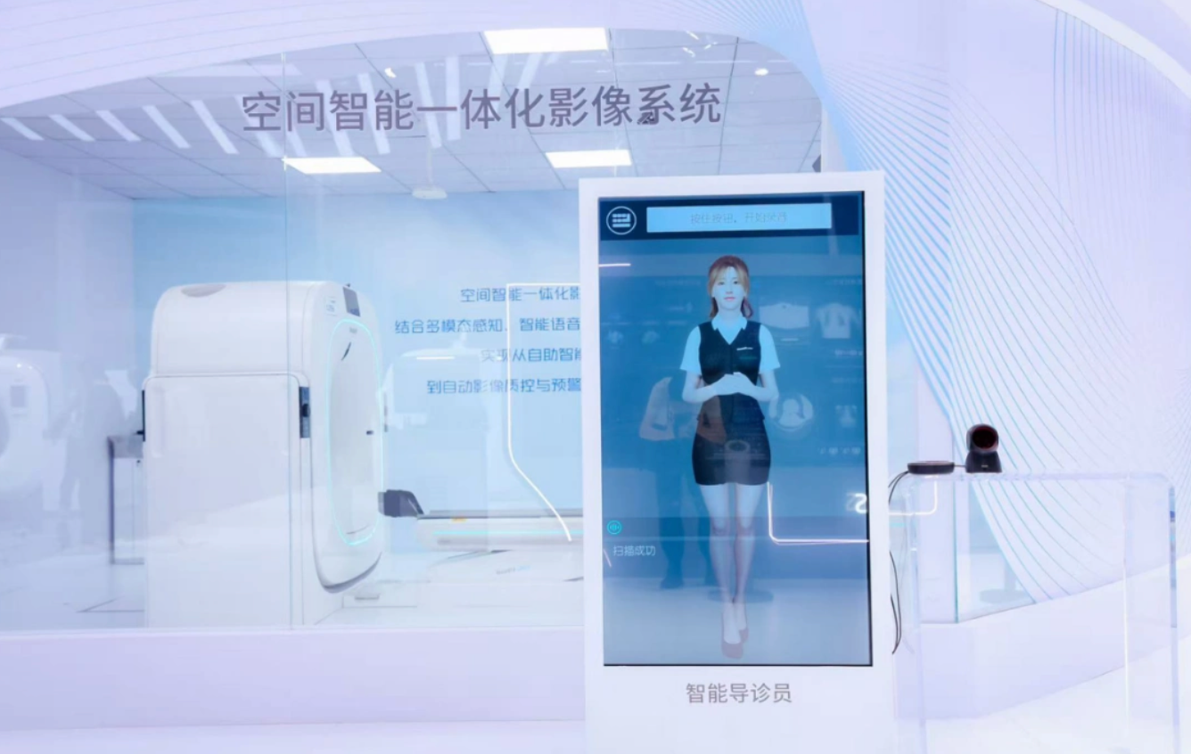 空间智能一体化影像系统则直击检查流程繁琐、摆位困难、基层水平不均等痛点,以AI大模型为核心,融合多模态感知与智能语音交互,实现从自助登记到自动扫描的全流程自动化——在三甲医院让患者少排队,在基层医院如同身边专家手把手指导,拍出合格图像。